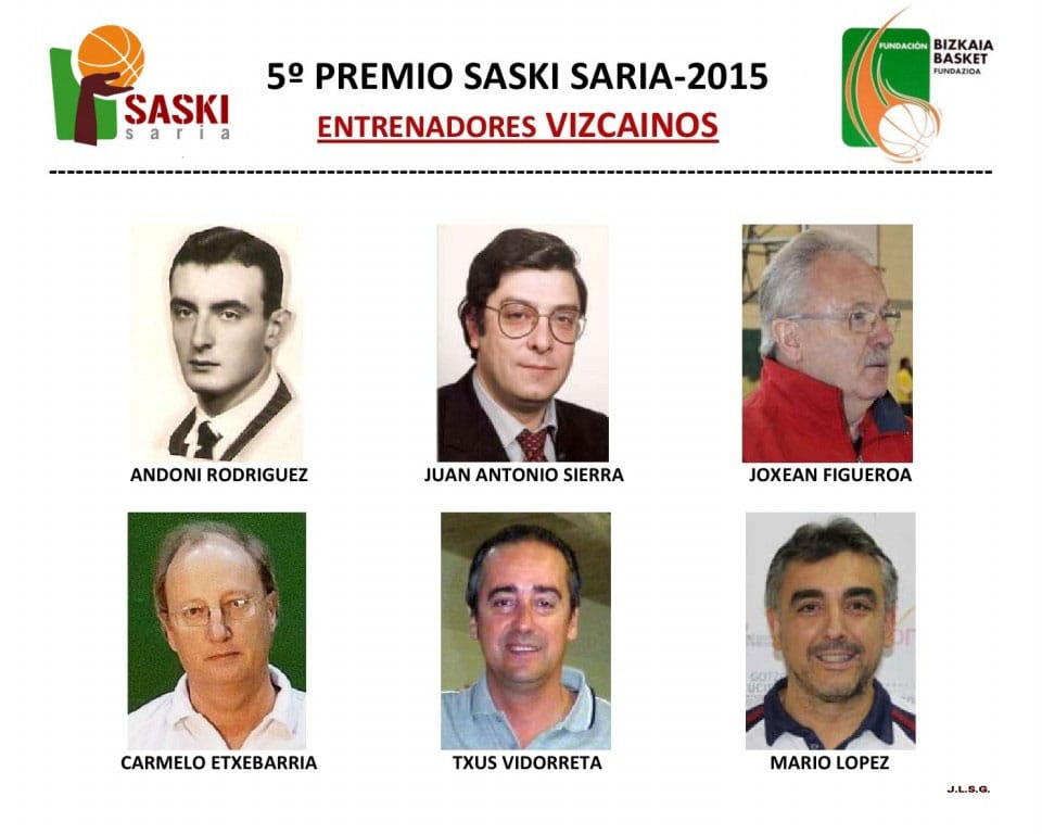 Andoni Rodríguez, Juan Antonio Sierra, Joxean Figueroa, Carmelo Etxebarria, Txus Vidorreta, Mario Lopez Los entrenadores premiados de las distintas épocas de nuestro baloncesto Aparece esta foto en la página 514 del libro (Saskibaloiaren 75 Urteko Ibilbidea Bizkaian/75 Años de Baloncesto en Bizkaia)