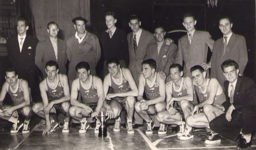 De izquierda a derecha, de pie : Directivos y seguidores con Emiliano Rodriguez y Manolo Rey (periodista), agachados : Luis Mª Lacambra, Andoni Rodriguez, Celestino Basterrica, Javier Leria, Agustin Esparta, Anton Larrauri, Arana y Paco Diez