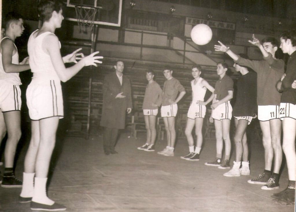 Antonio Diaz Miguel con la ayuda de Antón Larrauri en la captación de jóvenes de envergadura en la «Operación Altura», celebrada en Bilbao Aparece esta foto en la página 106 del libro (Saskibaloiaren 75 Urteko Ibilbidea Bizkaian/75 Años de Baloncesto en Bizkaia)