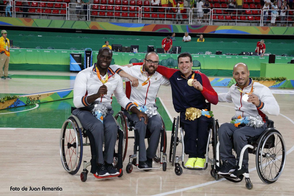En la foto de Juan Armentia, vemos a los cuatro medallistas del Bidaideak-Bilbao BSR en los Juegos Paralímpicos de Rio: Amadou Dialló, Asier García, Joshua Turek, y David Mouriz. Aparece esta foto en la página 529 del libro (Saskibaloiaren 75 Urteko Ibilbidea Bizkaian/75 Años de Baloncesto en Bizkaia)