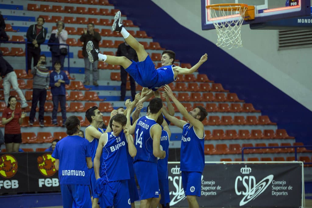 Iñigo Betolaza es manteado por sus compañeros del Bilbao Unamuno, tras meter el triple que les permitio ser lideres del grupo y pasar a los octavos de final del Campeonato de España Junior masculino Aparece esta foto en la página 536 del libro (Saskibaloiaren 75 Urteko Ibilbidea Bizkaian/75 Años de Baloncesto en Bizkaia)