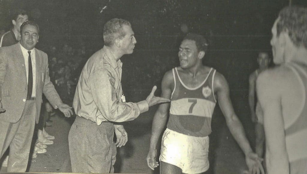 Como preparación a los partidos de promoción se celebró un partido amistoso entre el Aguilas (reforzado con Luyck y Burgess) y el Sporting de Montevideo (Uruguay), el arbitraje corrio a cargo de los Hermanos Saez Aparece esta foto en la página 102 del libro (Saskibaloiaren 75 Urteko Ibilbidea Bizkaian/75 Años de Baloncesto en Bizkaia)