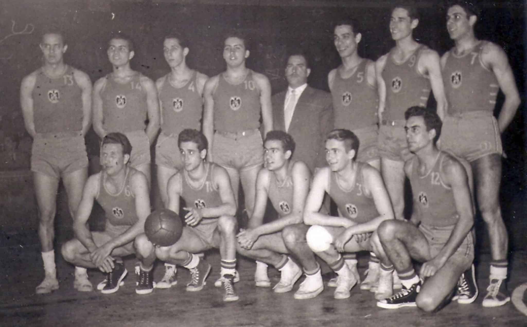 Selección Española que se enfrentó a la de Bélgica en el Frontón Euskalduna de Bilbao el 18 de marzo de 1953. Los componentes de la Selección Española, fueron: Pinedo, Borrás, Dalmau, Imedio, Brunet, Herrnández, Galindez, Oller, Massaguer, Garrido, Masferrer y Parra Aparece esta foto en la página 47 del libro (Saskibaloiaren 75 Urteko Ibilbidea Bizkaian/75 Años de Baloncesto en Bizkaia)