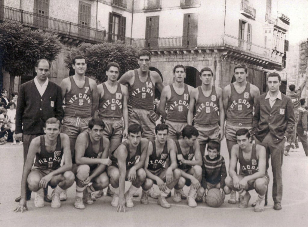 Componentes del equipo, de izquierda a derecha, de pie : José L. Arrondo (Delegado), Gonzalo Urquiza, Felix Mendia, Fede Alonso, Javier Aparicio, Fito Garcés, Iñaki San Martin, José Luis Ereña (Entrenador), agachados : Juanchu Urberuega, Helguera, Tomás Bediaga, José Luis Serrano, José M. Berriozabal, niño, Alejandro Zamora Campeones (Medalla de Oro) en los III Juegos del Cantábrico celebrados en Guipuzcoa Aparece esta foto en la página 112 del libro (Saskibaloiaren 75 Urteko Ibilbidea Bizkaian/75 Años de Baloncesto en Bizkaia)